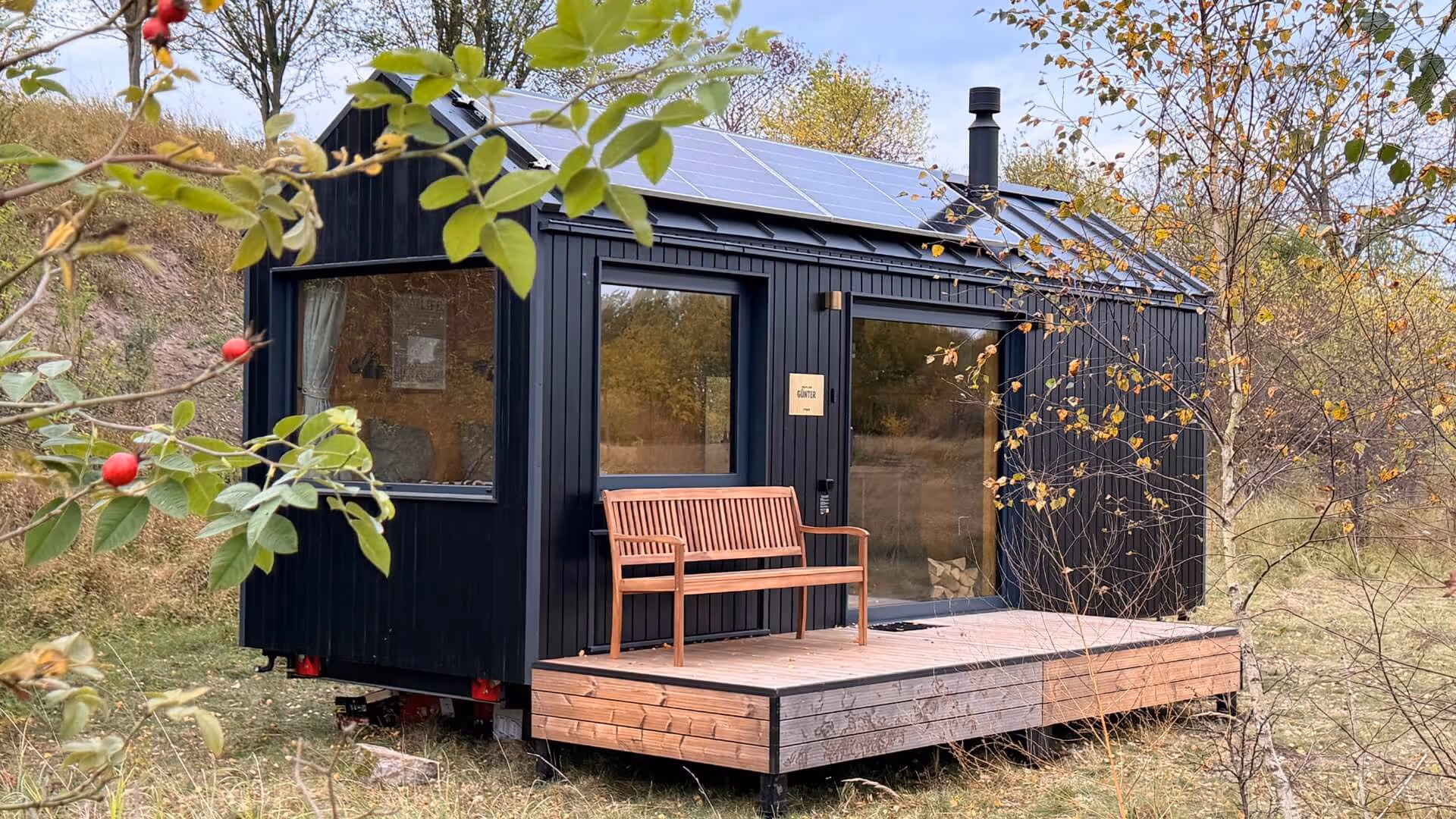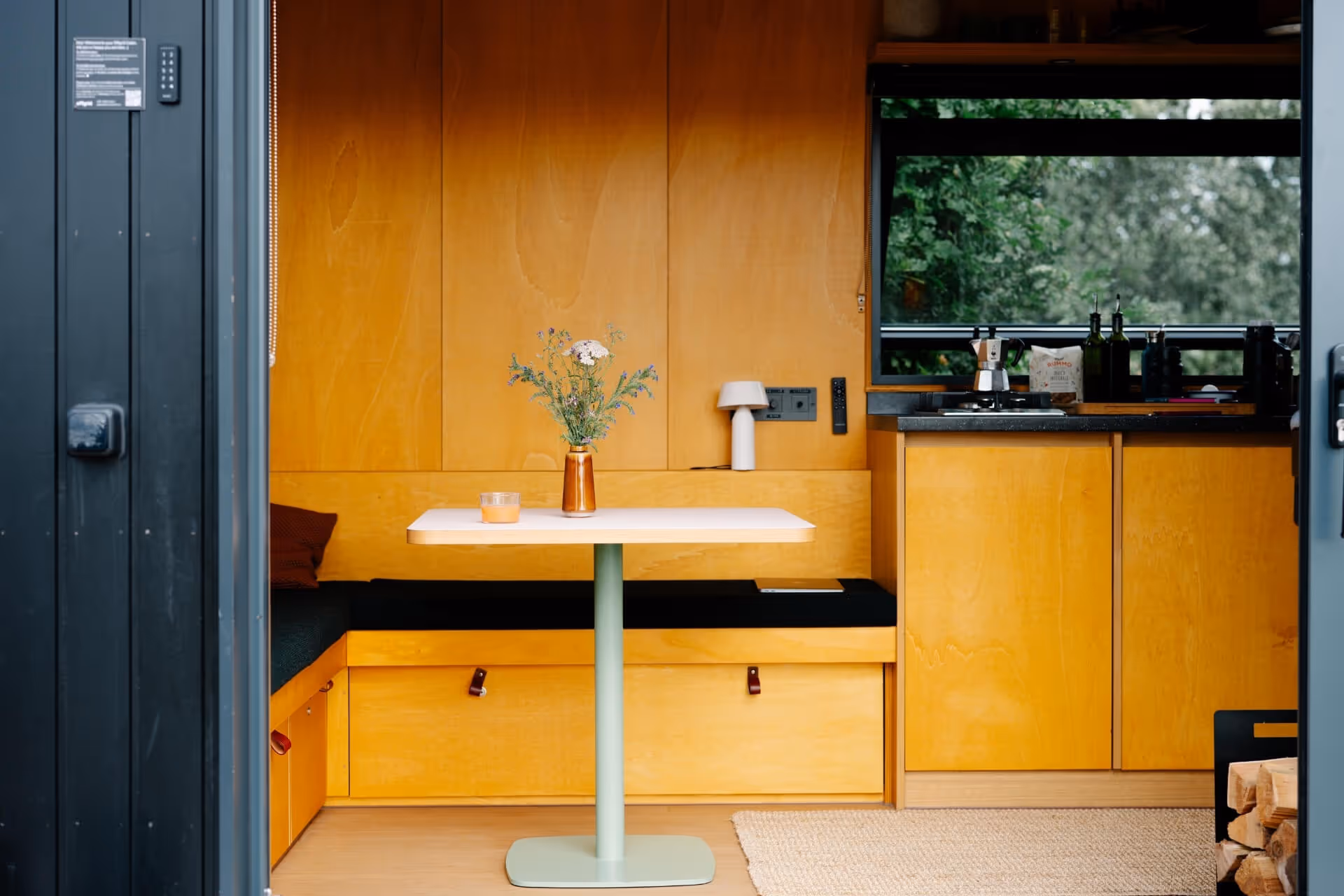 Cabin Günter stands deep among trees and still air. The scent of nature and rain drifts through open windows, and the grassy floor softens every step. It’s a place to breathe, pause, and feel the quiet pulse of Brandenburg’s wild calm.